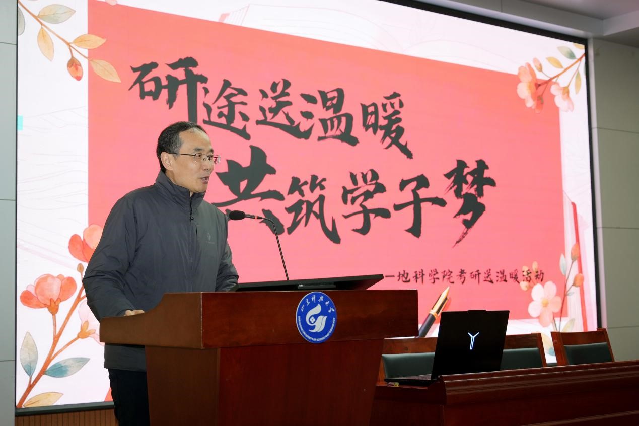 2026年全国硕士研究生招生考试已进入冲刺阶段。为助力2022级考研学子以最佳状态备战迎考,12月10日下午,地科学院于J6-433报告厅举行“‘研’途送温暖,共筑学子梦”考研送温暖活动。学院院长常象春、党委副书记兼副院长李晓静出席活动,学生工作办公室主任(团委书记)王文鑫、地球物理系党支部书记赵俐红、学院2022级班主任代表及全体辅导员参加活动,与考研学生交流互动。