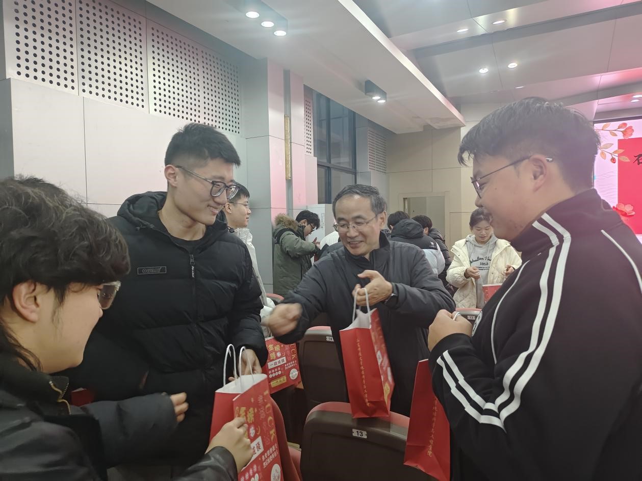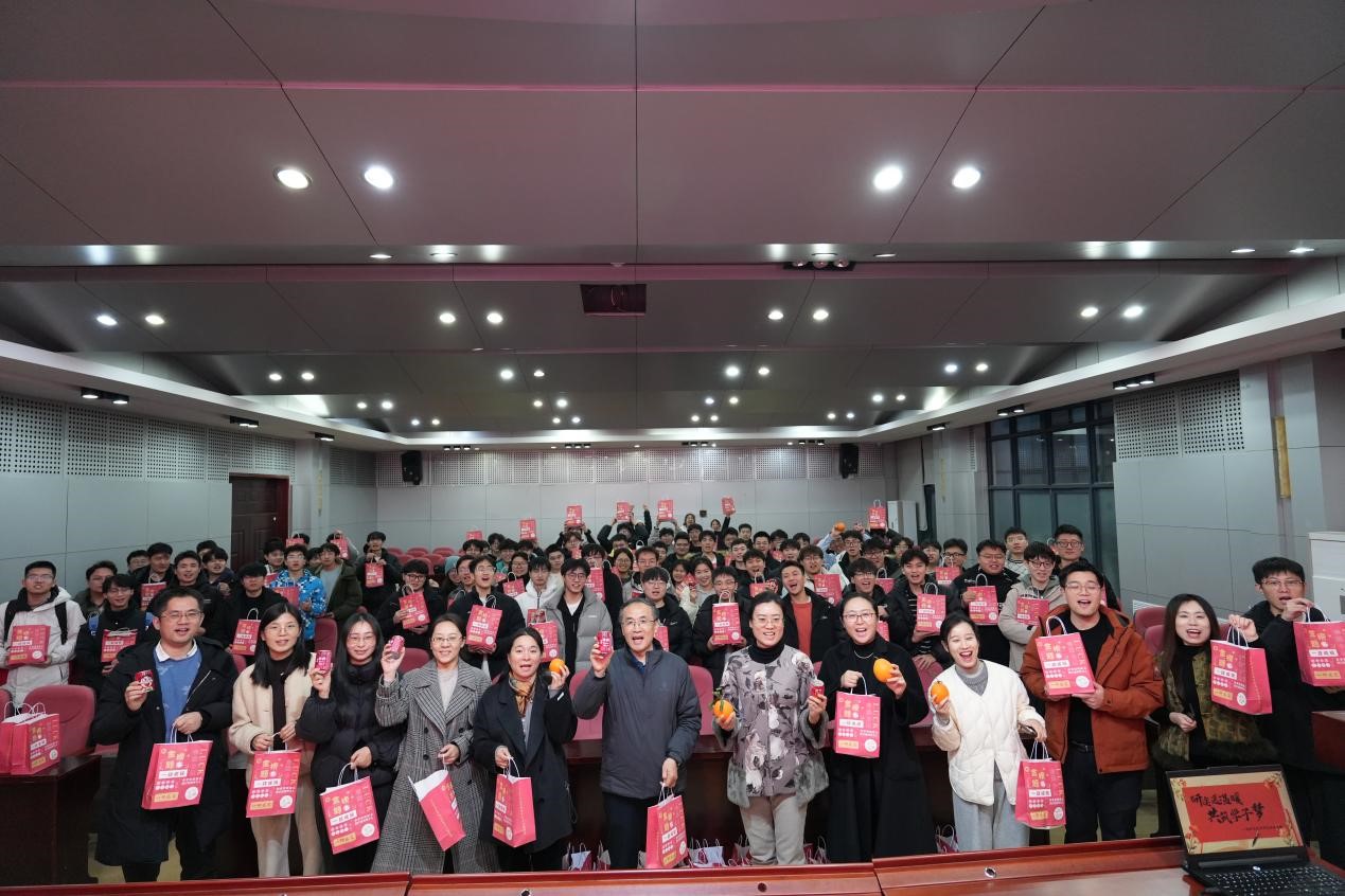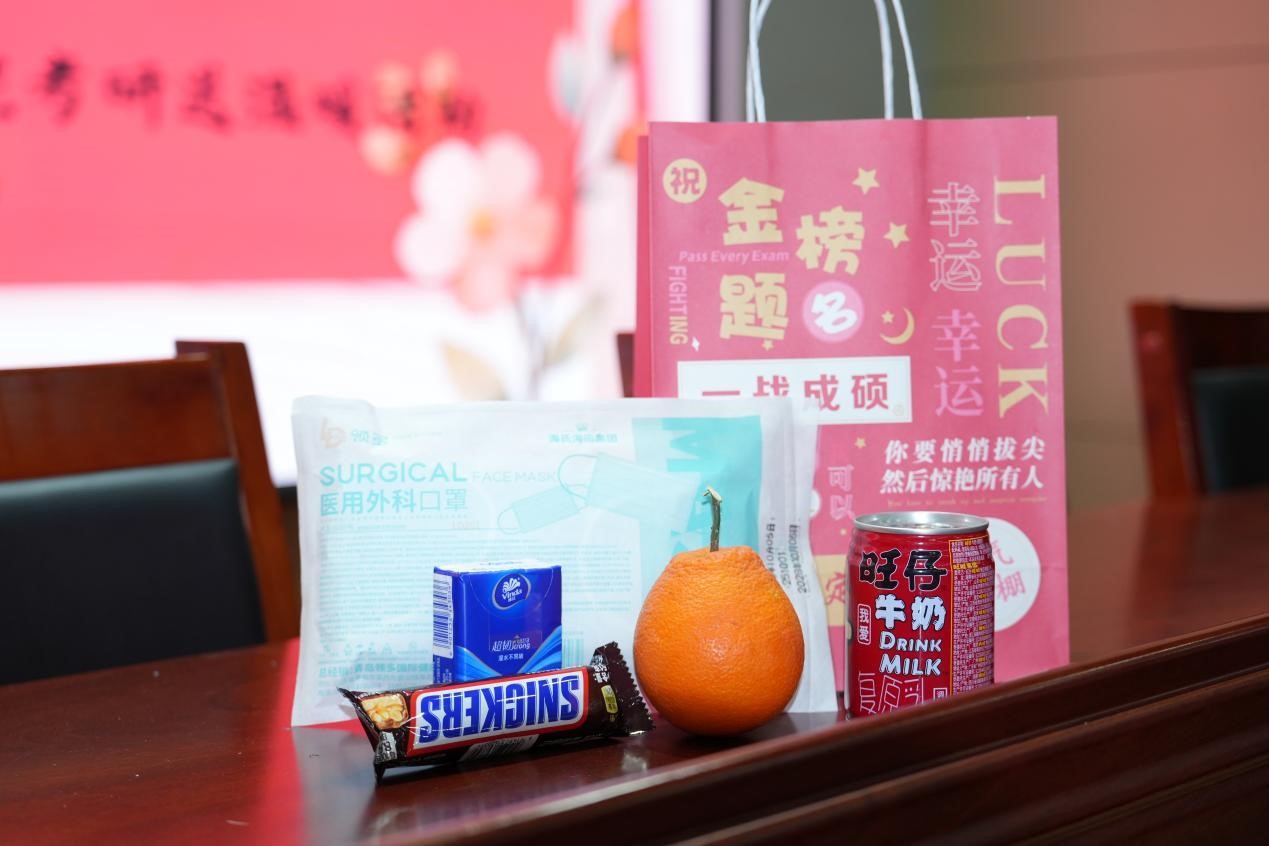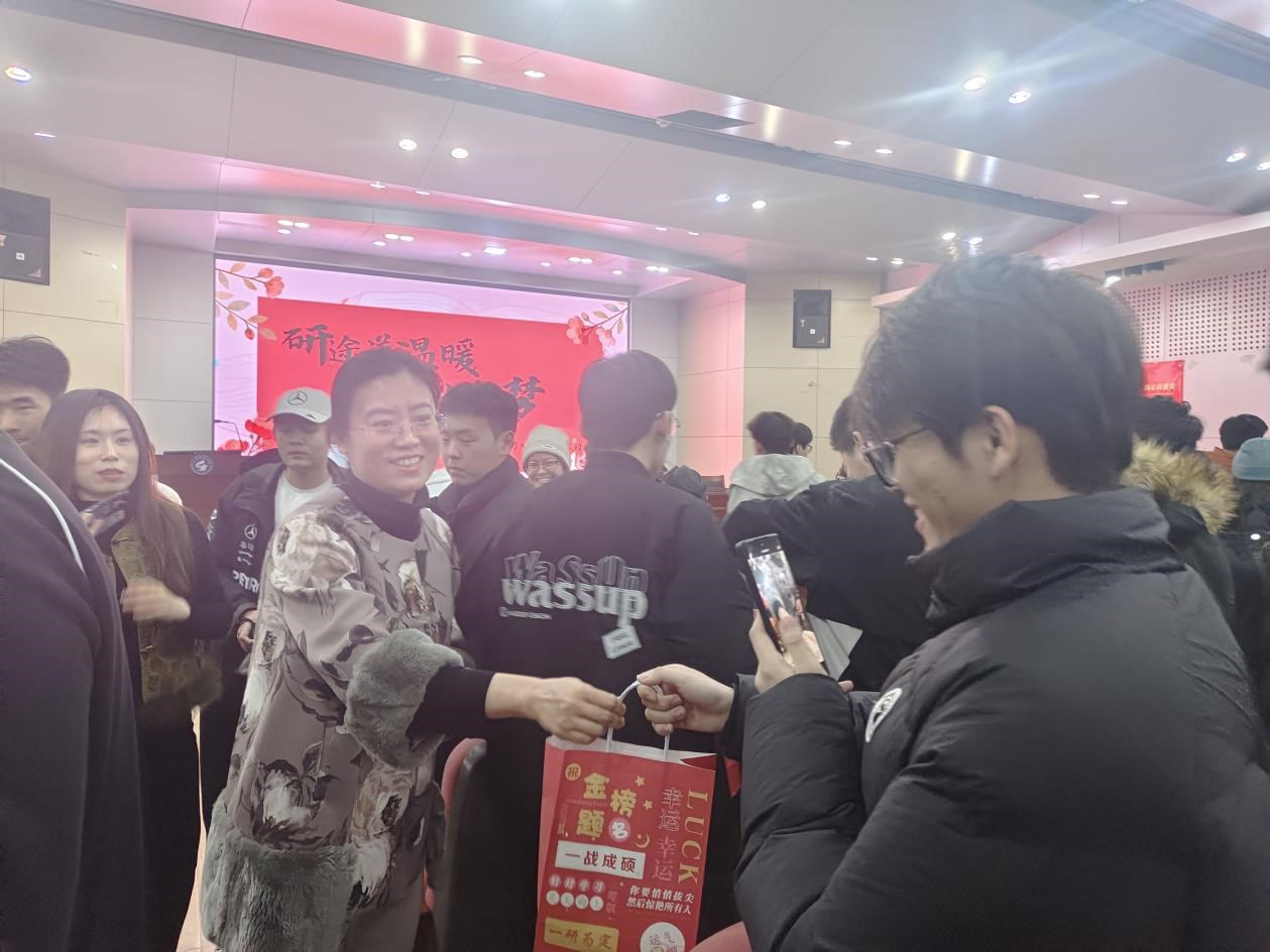 随后,老师们为考研学子送上了学院精心准备的“金榜题名”考研暖心礼包。每份礼包内含寓意“强盾护体”的口罩纸巾、“旺气冲天”的旺仔牛奶、“活力满满”的士力架以及象征“一战‘橙’功”的甜橙。小小礼包,承载着学院的深切关怀;甜甜橙子,寄托着美好的真挚祝愿,让同学们在寒冬备考路上倍感温暖、倍添动力。收到礼物的同学们脸上绽放笑容,纷纷表达对学院暖心支持的感谢,并齐声喊出“金榜题名,一战成‘硕’”的响亮口号,坚定有力的声音回荡在整个报告厅。