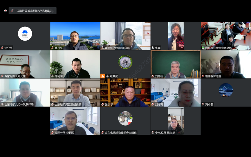受疫情影响本次竞赛于线上举办,来自山东科技大学、山东大学、中国海洋大学、中国石油大学(华东)、山东理工大学省内5所高校的8支代表队参加了此次竞赛的总决赛。竞赛类别分为地震类和重磁电类两组,赛项内容包括必答题和选答题两个部分,考查各参赛队伍对地球物理知识的掌握程度以及各参赛选手的应变和表达能力。大赛前,工作人员提前布置场地,做好了充分准备,参赛队伍提前进行调试。经过各代表队激烈角逐、评委认真评审和评审委员会审定,本次大赛共评选出地震组一等奖1项、二等奖1项、三等奖1项;重磁电组一等奖1项、二等奖2项、三等奖2项,优秀指导老师奖7位及优秀组织奖1项。