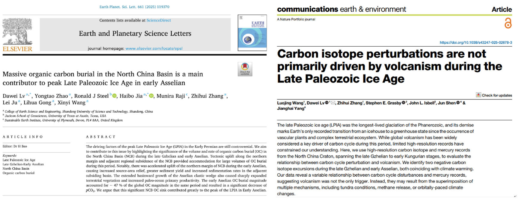 近日,我院吕大炜教授团队在国家自然科学基金(批准号:U24A20595, 42472166, 41972170)的支持下,联合美国、英国科学家,在晚古生代大冰期研究方面取得重要进展,研究成果分别以“Massive organic carbon burial in the North China Basin is a main contributor to peak Late Paleozoic Ice Age in early Asselian”和“Carbon isotope perturbations are not primarily driven by volcanism during the Late Paleozoic Ice Age”为题,发表于地球科学领域国际顶级期刊《Earth and Planetary Science Letters》(自然指数期刊)和Nature旗下Communications Earth & Environment(NatureCommunications系列期刊)。