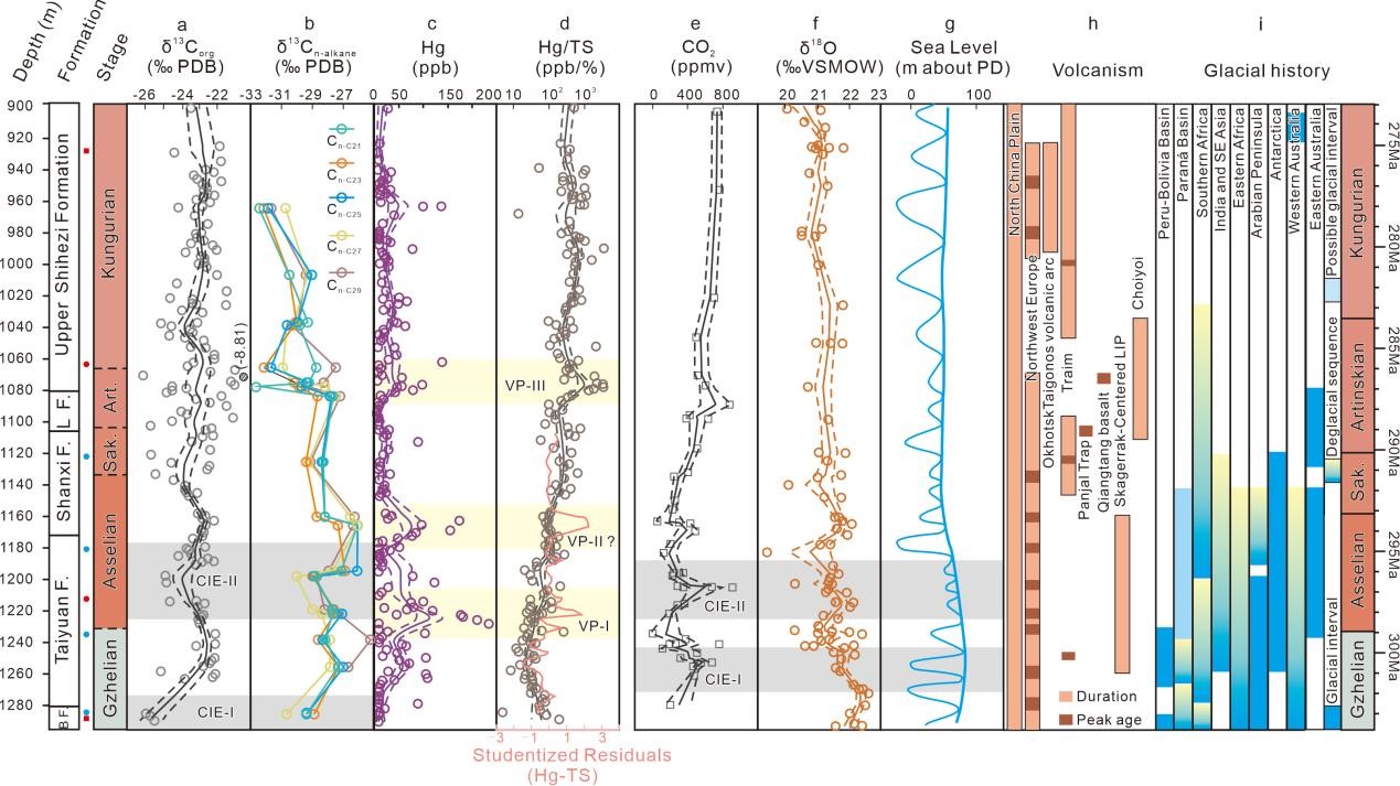图2 二叠纪-石炭纪过渡期:研究剖面地球化学记录(a-d)与全球气候、火山代用指标(e-i)的对比研究
