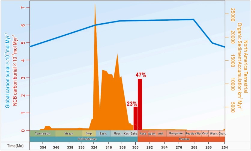 图1 华北板块晚格舍尔期—早阿瑟尔期巨量有机碳埋藏是维持晚古生代大冰期早阿瑟尔期高峰的关键因素。晚格舍尔期(23%)和早阿瑟尔期(47%)华北板块有机碳埋藏规模占同期全球比例