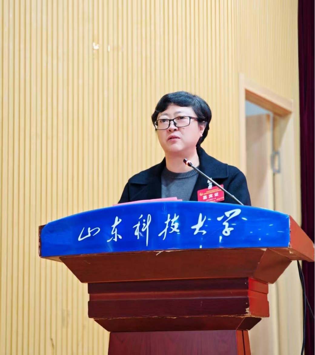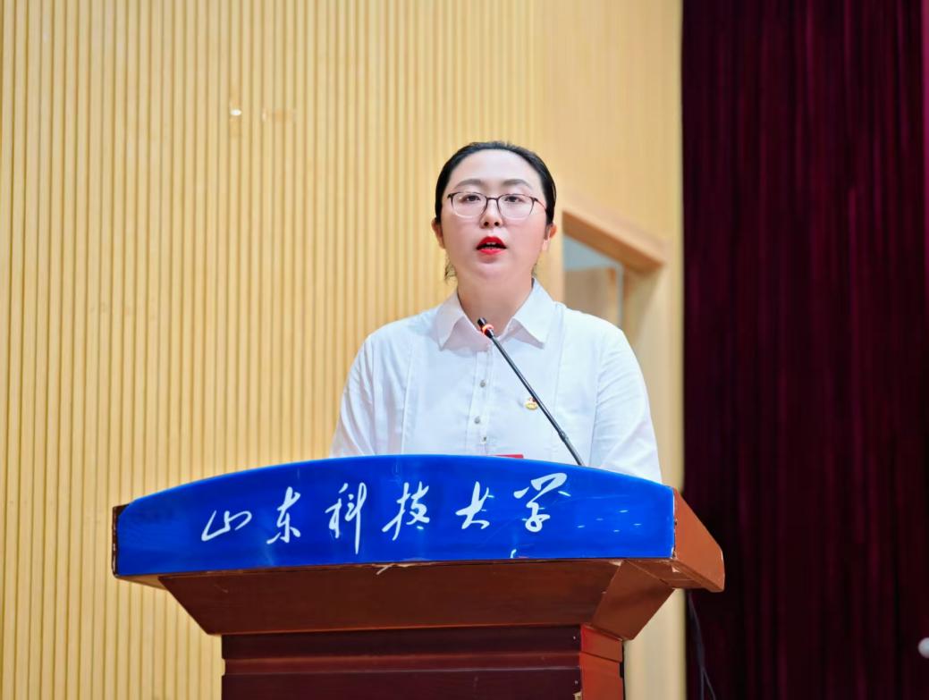 王文鑫代表共青团山东科技大学地球科学与工程学院向大会作《不忘初心跟党走地质报国担使命奋力谱写学院共青团事业高质量发展新篇章》工作报告。报告分为两个部分:一是全面回顾和总结地科学院共青团以往工作;二是确定今后地科学院共青团的工作思路与任务。