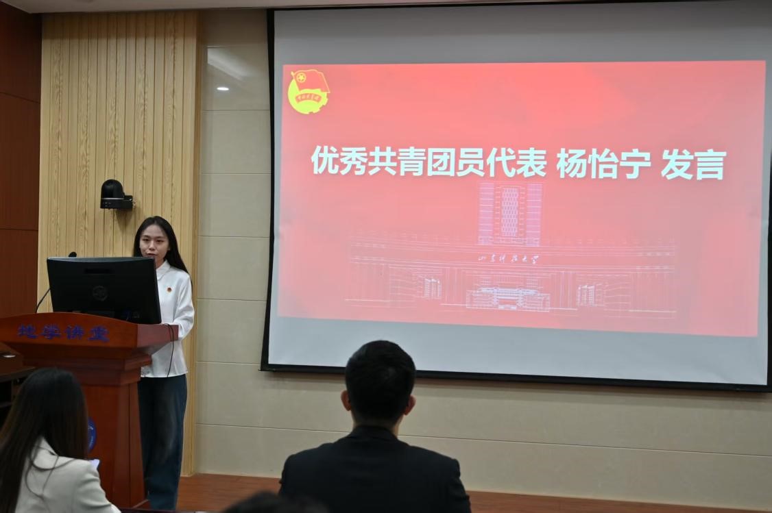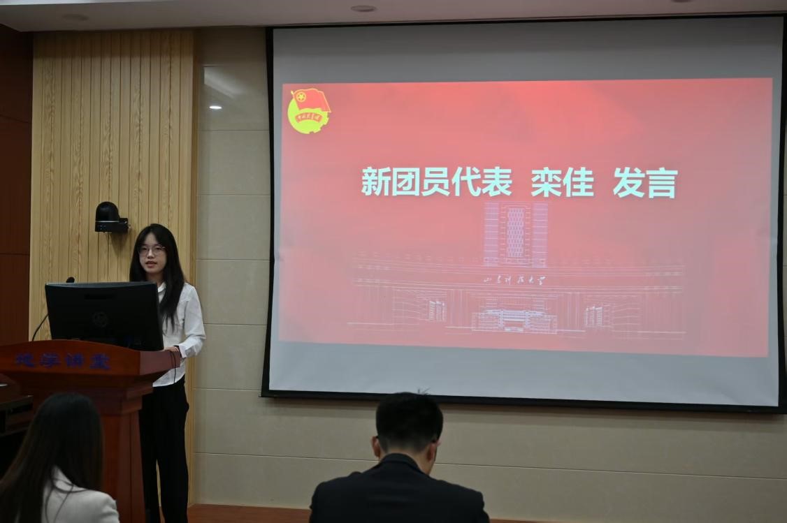 新团员代表栾佳表示,共青团员不仅是一份光荣的称号,更是一份沉甸甸的责任。作为新时代地学青年,将牢记“嵙魂匠心、地质报国”初心,珍惜在校学习时光,刻苦钻研地质专业知识,锤炼实践技能,努力将个人成长融入国家发展大局,为实现中华民族伟大复兴的中国梦贡献青春力量。优秀团员代表杨怡宁结合自身科研实践与野外勘查经历,鼓励新团员们将铮铮誓言转化为具体行动:既要坚定理想信念,把团的要求内化于心、外化于行;也要立足专业特色,把学习的毅力、创新的动力与地质报国的使命相结合,在攻坚克难中砥砺青春底色。
