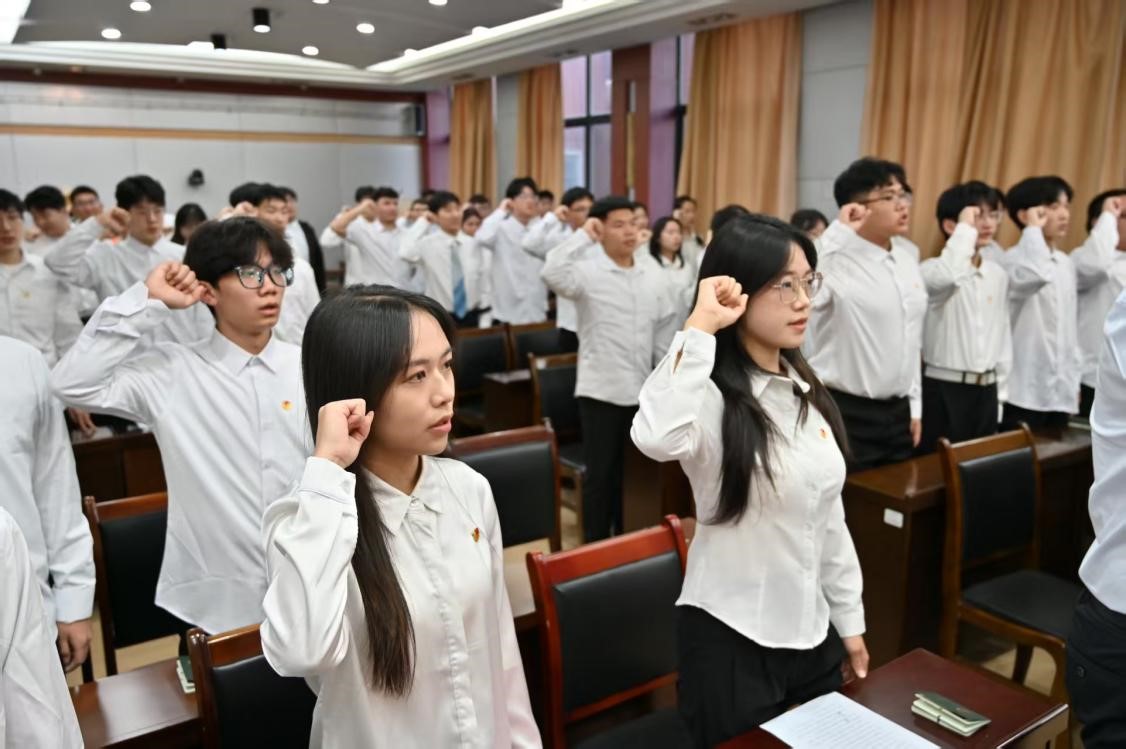 仪式在庄严的国歌声中拉开序幕,全体师生肃立致敬,齐唱国歌。仪式上,王文鑫宣读新团员代表名单,王键国领学《中国共产主义青年团章程》中团员义务与权利部分内容。各年级辅导员为新团员佩戴团徽,并颁发团员证。在领誓人带领下,23名新团员面向鲜艳的共青团团旗,高举右拳,庄严宣誓:“我志愿加入中国共产主义青年团,坚决拥护中国共产党的领导……为共产主义事业而奋斗!”铿锵有力的誓言彰显了新团员对团组织的绝对忠诚,更凝聚着他们以青春之我报效国家的坚定信念。