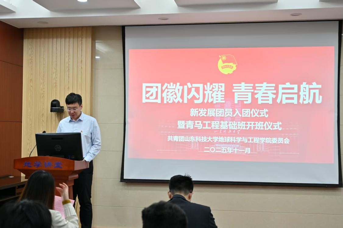 青春逢盛世,奋斗正当时。11月11日下午,地科学院“团徽闪耀青春起航”新发展团员入团仪式暨2025-2026学年青马工程基础班开班仪式在J6-530举行。学院团委书记王文鑫,辅导员王键国、曲兴玥,优秀团员代表、23名新入团团员及“青马工程”基础班全体学员参加仪式。