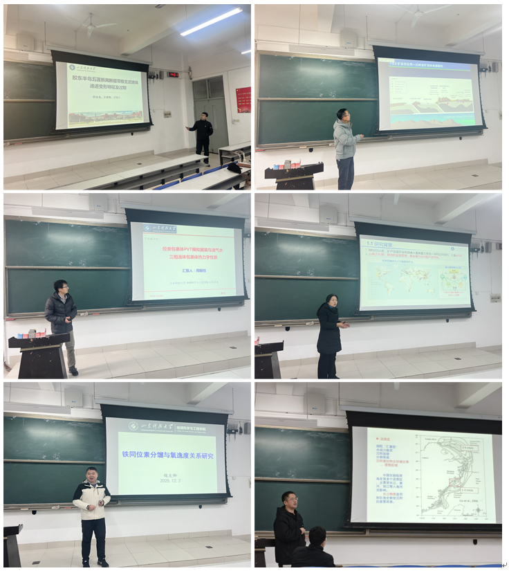报告会上,六位深耕相关地质领域的教师,围绕构造地质、同位素地球化学、矿床学、流体包裹体热力学、矿区环境科学及海洋沉积与环境演变,为师生带来一场兼具学术深度与实践价值的知识盛宴。倪金龙老师以《五莲拆离断层带假玄武玻璃递进变形过程与成因》为题,系统阐释了该断层带假玄武玻璃的微观变形演化机制与成因机理;魏友卿老师在《铁同位素分馏与氧逸度关系研究》,为相关领域研究提供了新的认知视角;李如操老师通过《丘岭金矿的成矿物质来源研究》,揭示了该类矿床成矿物质的供给路径与成矿作用机制;周振柱老师以《烃类包裹体PVT模拟困境与油气水三相流体包裹体热力学性质》为题,针对复杂流体包裹体研究中的核心瓶颈问题,展示该领域的最新研究进展;张丽萍老师关于《某废弃铁矿周边地下水重金属污染特征及迁移规律研究》,为矿区生态环境治理与修复提供了科学依据;刘金庆老师的《东海内陆架中晚全新世沉积特征与环境演变》研究,精准重建了该区域中晚全新世以来的沉积演化序列与古环境变迁过程。