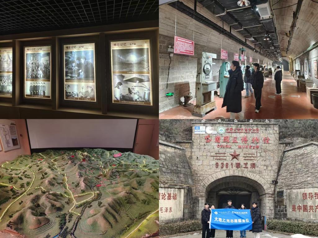 在9381军工洞旧址,队员们参观了生产设备、历史照片和实物展品,了解军工洞的建设背景、历史作用以及建设者们当年在极其艰苦的条件下,克服困难、自力更生、艰苦奋斗,为国防事业做出重要贡献的感人事迹,感悟“艰苦创业、无私奉献、团结协作、勇于创新”的三线精神内涵。在岱崮园区博物馆,队员们从物质组成、内动力作用及外动力作用等方面系统了解“顶平、身陡、麓缓”的岱崮地貌形成机理。队员们前往崮上草原实地考察岱崮地貌,结合所学专业知识分析地质特征,进一步加深了对岱崮地貌的认知,提升专业应用能力。