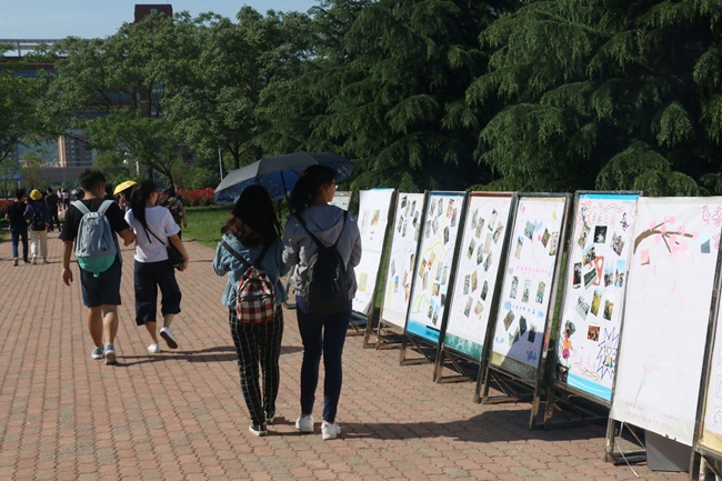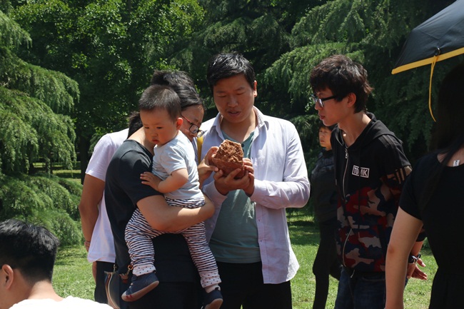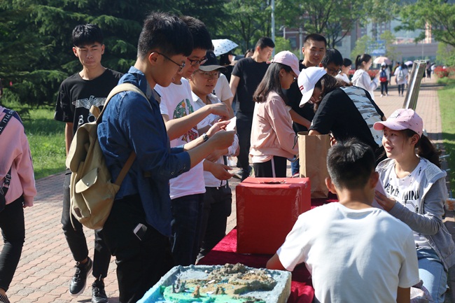 活动现场整齐地摆放着一排桌子,桌上摆放着琳琅满目的展品。有制作精美的地质模型,有优秀的手绘剖面测绘图,有完整珍贵的动植物化石标本,还有各种奇形怪状的岩石样本,其中蕴含着丰富的地学知识。一旁的展板上,粘贴着巢湖实习同学的照片和留言。虽然野外实习的条件比较艰苦,但同学们却非常享受穿梭于大自然中的快乐,这就是地质人的精神。同学们翻越一座座山头,穿过丛生的荆棘林,获得了最真实的一手资料和素材,才有了后来精致漂亮的手绘图。桌子的另一旁还设置了有奖问答的小游戏,经过的人们都可以参与其中,小游戏使非地质专业的同学们加深了对地学知识的了解和认识。