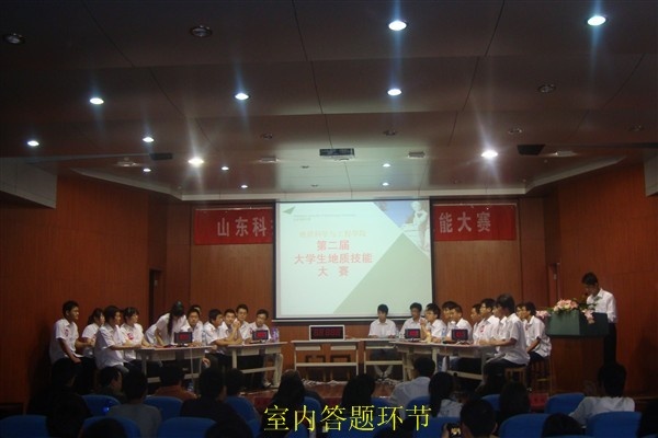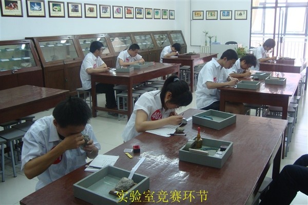 大赛启动仪式结束后,按照赛程安排,07级每班派4名参赛队员参加比赛。上午进行的是室内答题环节,共分三部分:必答题、抢答题以及风险对抗环节。题目涉及了选择、填空、判断、问答、读图等多种形式,复杂多变,综合程度很高。比赛中,选手们认真读题,仔细思考,联系专业知识作出自己的判断,很多选手以不俗的表现赢得了台下老师同学赞扬鼓励的掌声,表现出扎实的地质理论知识基本功。下午3点,动手实践环节在实验室展开。根据比赛要求,选手们要完成一个岩石薄片的镜下鉴定和一个手标本鉴定,实验室里选手们屏气凝神,细心观察,显示出了他们沉稳的心态和娴熟的操作技巧。
