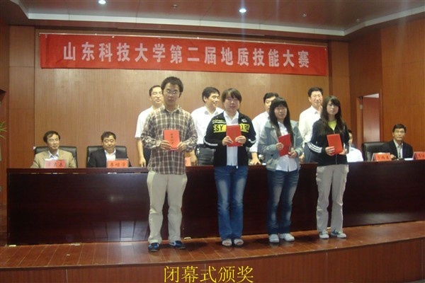 经过一天紧张激烈的比赛,第二届地质技能大赛比赛环节暂告一段落。在6月1日下午举行的闭幕式上,裁判长胡绍祥教授宣读了此次比赛结果——地质工程(定向)07-1班获得集体一等奖,地质工程07-3班、地质工程07-2班分获集体二、三等奖,张凤垒、郭彬彬获得个人一等奖,大赛还评出个人二等奖4名,三等奖6名;随后副裁判长李守军教授对本次比赛做了详细的总结和点评,指出同学们具有扎实的专业知识,但在技能方面还存在许多不足,指出了同学们今后应该努力的方向;李增学副院长宣读了表彰决定。最后吴强书记致闭幕词,他充分肯定了筹备委员会成员为这次比赛所做的充分准备,表扬了所有参赛队员在赛中发扬的团结拼搏精神,并指出学院要积极为下半年在成都理工大学举行的全国首届地质技能大赛做准备。至此,山东科技大学第二届地质技能大赛圆满落下帷幕。